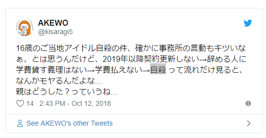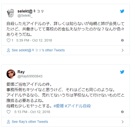 愛媛県などを中心に活動していた地方アイドルグループである愛の葉ガールズのメンバーであり、2018年3月に自さつしてしまった大本萌景さん。