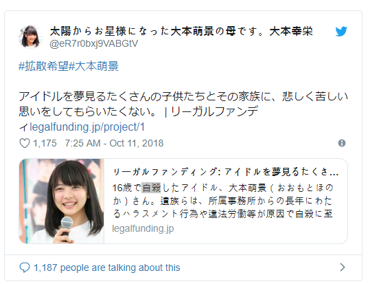 大本幸栄さんは、「アイドルを夢見るたくさんの子供たちとその家族に、悲しく苦しい思いをしてもらいたくない。」という名目で基金を募集しており、支援者数は200人を超えてます。