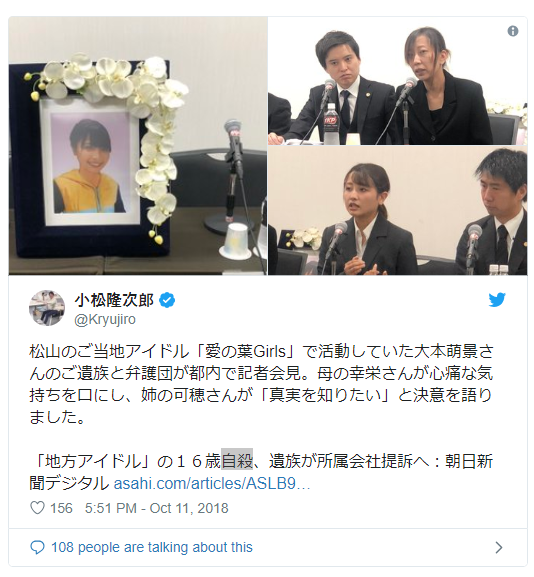 愛媛県を拠点にアイドルグループで活動し、2018年3月に自さつした大本萌景ほのかさん(当時16歳)の母親らが12日、自さつは過重労働やパワーハラスメントが原因として、所属していた芸能事務所などを相手取り、慰謝料など約9200万円の損害賠償を求めて松山地裁に提訴した。事務所側は「パワハラはなかった」と反論している。