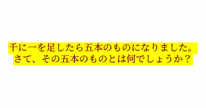 「千に一を足したら五本のものになりました」 頭が柔軟な人にしか解けないクイズ問題! 今回ご紹介するのは脳トレクイズです。 問題 :千に一を足したら五本のものになりました。さて、その五本のものとは何でしょうか? Google ADVERTISEMENT Google あなたはわかりましたか? それでは答え合わせに行きましょう! Google 答えは、、、「手」 ADVERTISEMENT Google 千と言う漢字に横線1本を加えると、五本指の「手」になります。 ADVERTISEMENT Google あなたは間違えずに解けたでしょうか! Google [著作権者VONVON /無断コピー、無断転載および再配布禁止(違反時の法的措置) ADVERTISEMENT