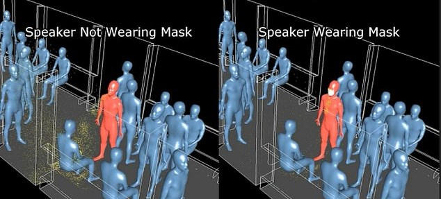 掲載された映像には、一般的な地下鉄の車内でマスクをしていない人が前の人と会話をするとき、目に見えない飛沫がどれほど周囲に影響を与えるのかをシミュレーションした結果が収められています。