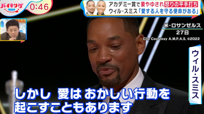 ウィルはアカデミー賞の授賞式にて、司会でコメディアンのクリス・ロックが、ウィルの妻であるジェイダ・ピンケット・スミスの円形脱毛症をイジったことに激怒し、壇上でクリスの顔面を平手打ちし、その行為に賛否の意見が湧いていました。駒場は騒動に関する動画をさまざま見ていると明かすと、なんと「俺はウィル・スミスさん側やな」と擁護し、続けて、「グーでボコボコにしたわけではなく、ギリギリ抑えてビンタやったと思うねん。めちゃくちゃ強くじゃない」と、〝パンチではなく平手打ちならセーフ〟という謎の基準を口にしました。