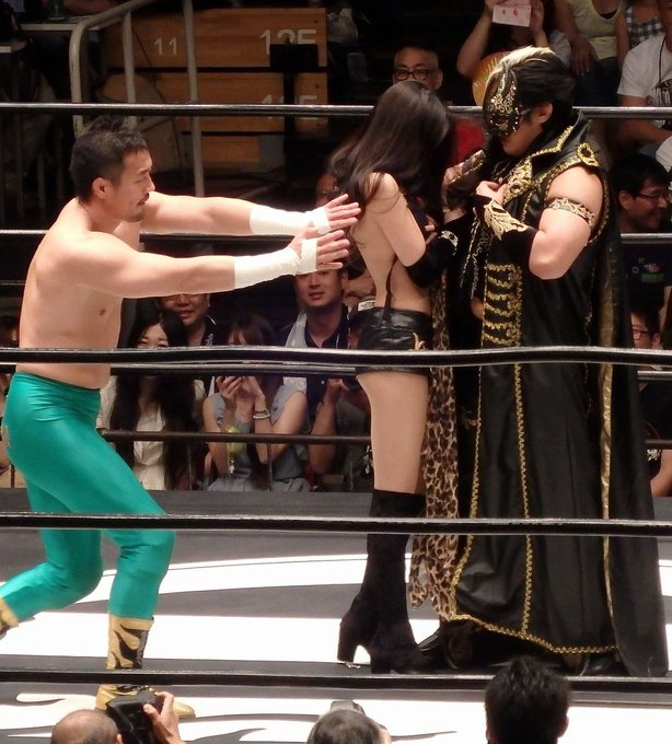 ハプニングは2016年、そのタイチさんと参戦した試合で起きました。際どいユニフォームを着て対戦相手の真壁刀義さんを挑発するあべみほさんですが、ロープに足をかけようとしたところ、滑って真壁さんの方に、体がもたれかかってしましました。