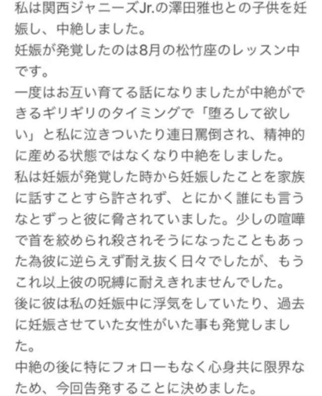 女性は今年1月にSNSを通じ、澤田と体の関係を持ったと思われる女性が妊娠と中絶を告発したのです。