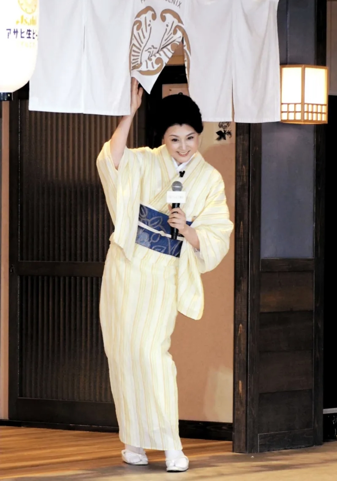 藤原さんはクリーム色の着物にブルーの帯を締め、のれんをくぐって登場。今回のマルエフ横丁のイメージカラーに合わせて選んだ着物だそうで、MCから「さすがの着こなし、美しいです!」と声をかけられると、「とんでもございません」と謙遜していました。