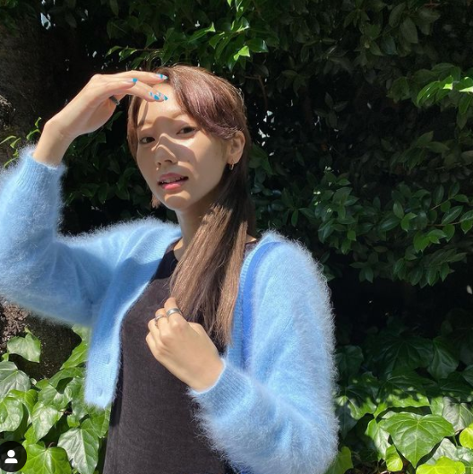 写真の武田さんは、ブルーのモヘアカーディガンを羽織り、こちらに視線を向けて眩しそうな顔をしています。
