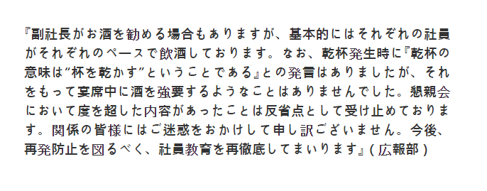 「喜㔟副社長は体育会系でお酒にかなり強い。無礼講と言えども逆らうことは出来ず、社員は喜㔟副社長のペースに合わせ、勧められるがまま飲む他なかった。」とJR東日本関係者は語っています。