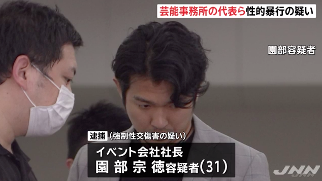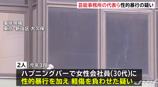 今回強制性交傷害の疑いで逮捕されたのは芸能事務所「ワールドビジョンプロ」の代表取締役、塩見剛史容疑者(39)とイベント会社社長、園部宗徳容疑者(31)の2人です。警視庁の発表によりますと、2人は今年3月、新宿区大久保のハプニングバーで30代の女性会社員に性的暴行を加え、軽傷を負わせた疑いが持たれています。