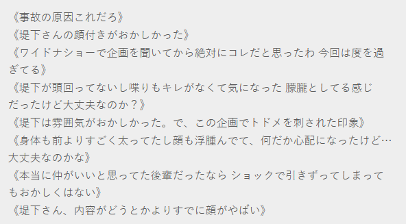 後輩の本音に顔付きが凍ばったのでした。ショックを引きずって事故を招いたのではないか?というコメントが上がるのも分かる気がしますね。これが堤下の見納めとなるのか今後の動向に注目が集まります。
