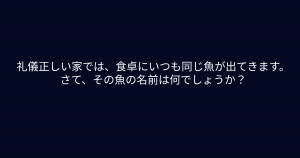 ”礼儀正しい家では、食卓にいつも同じ魚が出てきます。” 文章をよく読むと答えが見えてくる!? 今回ご紹介するのは脳トレクイズです。 問題 礼儀正しい家では、食卓にいつも同じ魚が出てきます。 さて、その魚の名前は何でしょうか? google ADVERTISEMENT Google あなたはわかりましたか? それでは答え合わせに行きましょう! Google 答えは、、、「鱒」 ADVERTISEMENT 礼儀正しい家の場合、いつも食事前に「いただきます」と言います。いただき「ます」だけに「鱒」の魚がいつも出てきます。 ADVERTISEMENT Google あなたは間違えずに解けたでしょうか! Google [著作権者VONVON /無断コピー、無断転載および再配布禁止(違反時の法的措置) ADVERTISEMENT