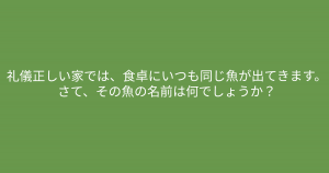 ”礼儀正しい家では、、、” ある部分に注目すると答えに近づけるかも? 今回ご紹介するのは脳トレクイズです。 問題 礼儀正しい家では、食卓にいつも同じ魚が出てきます。 さて、その魚の名前は何でしょうか? Google ADVERTISEMENT Google あなたはわかりましたか? それでは答え合わせに行きましょう! Google 答えは、、、「鱒」 ADVERTISEMENT 礼儀正しい家の場合、いつも食事前に「いただきます」と言います。いただき「ます」だけに「鱒」の魚がいつも出てきます。 ADVERTISEMENT Google あなたは間違えずに解けたでしょうか! Google [著作権者VONVON /無断コピー、無断転載および再配布禁止(違反時の法的措置)] ADVERTISEMENT