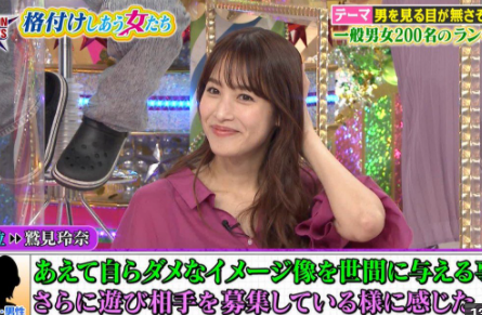 女性タレントがそれぞれお互いを評論し合うなか、鷲見さんはどんな男性と付き合いたいか?と聞かれると、「最初はガンガン追いかけられて、押し負けて付き合いたい」と男性側からの猛烈なアプローチを熱望すると明かしました。