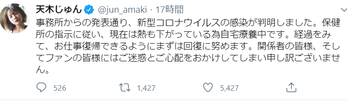 3日、人気グラビアアイドルの天木じゅんさんが、自身のツイッターを更新。「新型コロナウイルスの感染が判明しました」と新型コロナウイルスに感染したことを発表しました!現在は熱も下がっているようで、保健所の指示に従い、自宅療養中であることを明かしています。