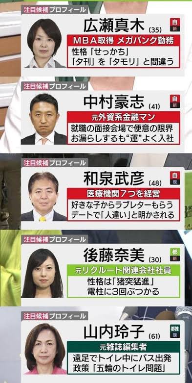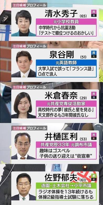 こちらの番組内では定番となっている「立候補者プロフィール」が、かなりユニークで面白いです。