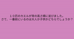 「10匹のニワトリがいました。そのニワトリを、背の高さ順に一列に並ばせました。さて、一番前に並んでいるニワトリは、大人か子供か、どちらでしょうか?」
