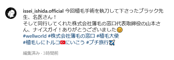 植毛手術を受けた後の姿をインスタグラムに投稿しました。