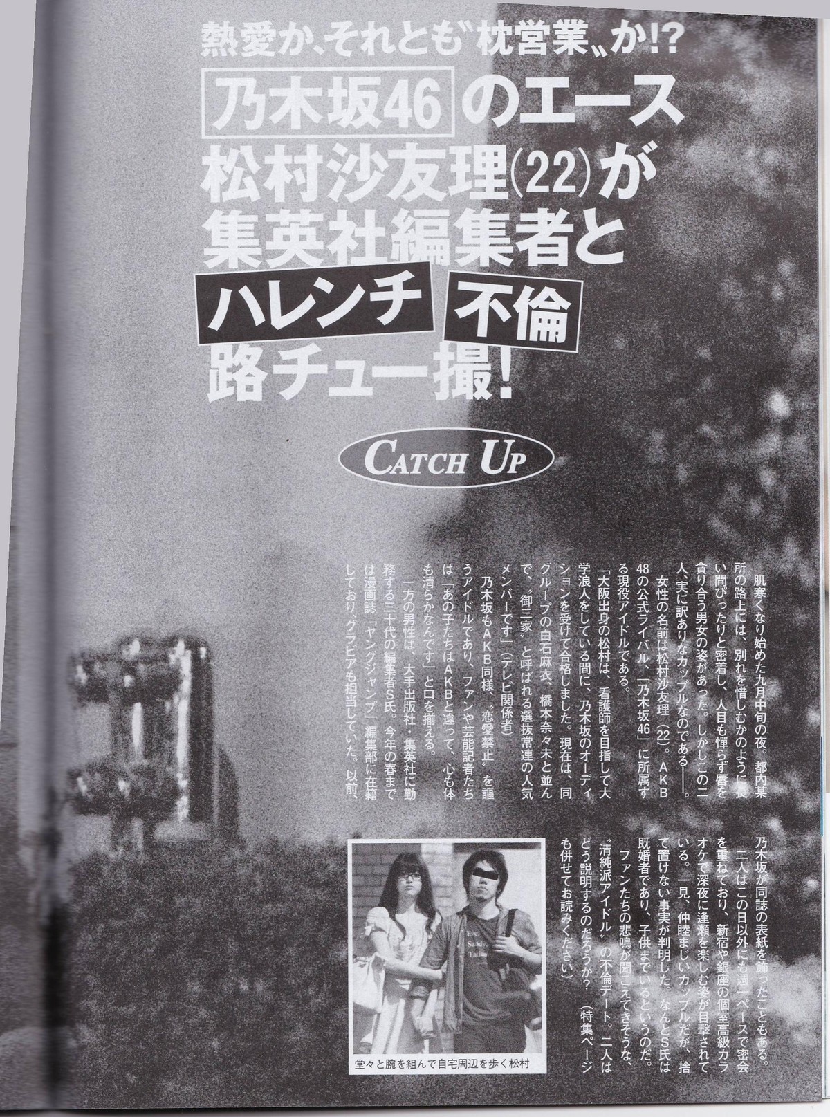 今月末から始まったドラマ『エルピス―希望、あるいは災い―』でアナウンサー役を演じる長澤まさみの〝路チュー写真〟が過激だとしてネット上で話題を集めたが、現実のスクープはこんなに生易しいものではありませんでした。近年もっともスキャンダラスだった〝路チュー報道〟といえば、当時『乃木坂46』に所属していた松村沙友理と大手出版社編集員とのスクープではないでしょうか?