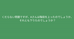 ”くだらない問題ですが、、、、” 問題文をよく読んで解いてみましょう 今回ご紹介するのは脳トレクイズです。 問題 くだらない問題ですが、Aさんは階段を上ったのでしょうか、それとも下りたのでしょうか? Google ADVERTISEMENT Google あなたはわかりましたか? それでは答え合わせに行きましょう! Google 答えは、、、「上った」 ADVERTISEMENT 問題文に「くだらない問題」とありますので、下らない「上り」が答えになります。 Google あなたは間違えずに解けたでしょうか! ADVERTISEMENT Google [著作権者VONVON /無断コピー、無断転載および再配布禁止(違反時の法的措置)]
