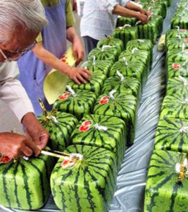 1978年に生まれた立方体スイカです。この形は成長段階でスイカを四角い型に入れて育てます。
