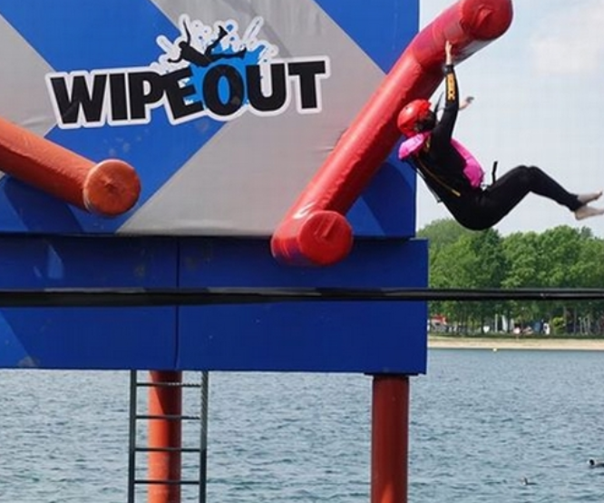 該当施設では、水上に18のアトラクションを設置しています。最初は、球状で軟らかい巨大な4つのボールを渡りきる「ビッグレットボールズ」に挑戦することになりました。