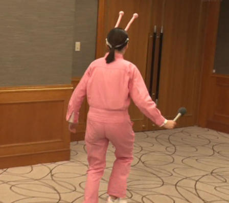 ピンクのつなぎ姿に触角のカチューシャを頭に付けて現れました。