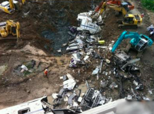 さらに以前には、中国浙江省温州市の甬台温線(杭福深旅客専用線の一部)で、2011年7月23日20時34分頃(中国標準時)に発生した中国高速鉄道の衝突・脱線事故がありました。犠牲者は40人にも上りました。この時、脱線・落下した6つの車両は満員時には600人乗れることになります。しかし、新華社の数字に基づいて計算すると、600-211(負傷者数)ー35(犠牲者数)=354人になるのです。この354人はどこに消えたのでしょうか。なぜ慌てて埋めたのでしょうか。中国内でも事故車両が現場で埋められる対応に疑問の声が上がったようです。
