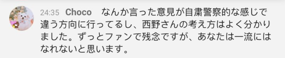 《説教をしていたかどうかは公開しているんだから、第3者が決める事。西野氏と一般女性の二人だけでやり取りしていればその限りではないけれども。要するに西野氏は客観的目線から自分を評価できない人なんでしょう。一般社会では評価するのは外部目線ですよ… 》
