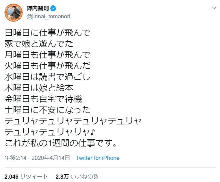 このようなやりとりの後、14日に更新した内容には《日曜日に仕事が飛んで 家で娘と遊んでた 月曜日も仕事が飛んで 火曜日も仕事が飛んだ 水曜日は読書で過ごし 木曜日は娘と絵本 金曜日も自宅で待機 土曜日に不安になった テュリャテュリャテュリャテュリャ テュリャテュリャリャ♪ これが私の1週間の仕事です》と替え歌に乗せて見事に表現。