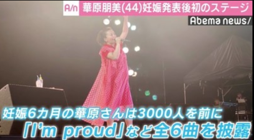ステージに立った華原さんは、ゆったりとした赤いワンピースに、ヒールのないサンダル姿で登場し、1曲目にヒット曲「I BELIEVE」を熱唱。歌い終えると、「うれしいことに、赤ちゃんができました。きょうはお腹の赤ちゃんも一緒に、このステージをみんなと一緒に楽しみたい」とファンを前に妊娠を報告しました。