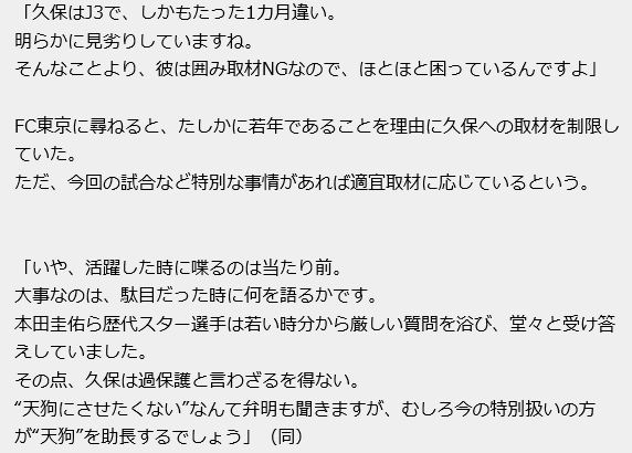 当時彼が所属していたFC東京によれば、たしかに若年であることを理由に久保への取材を制限していました。ただ、特別な事情があれば適宜取材に応じていたとのこと。