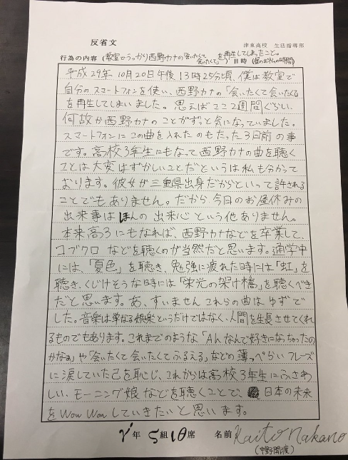 また、西野カナ事件の『反省文』はまだ先生に提出していないとのこと。2016年に書かれたものを見る限り、冗談の通じる先生なのでしょうか?