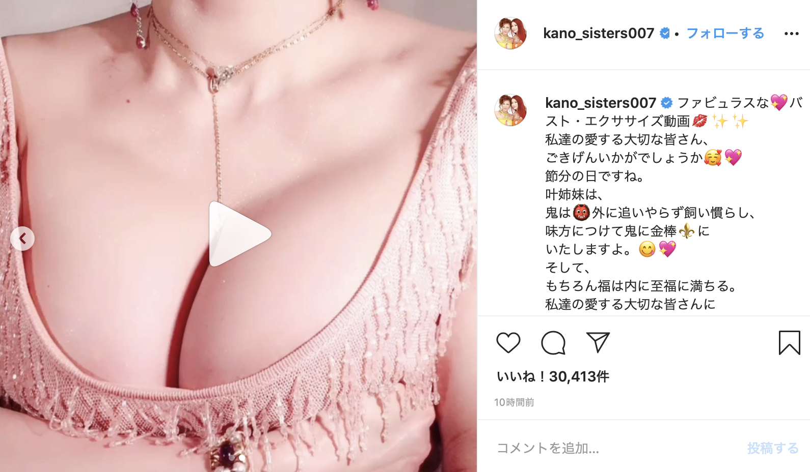 なんともインパクトのある動画がインスタグラムを賑わせています。昨年2月3日、叶姉妹・美香さんが公式インスタグラムを更新し、バスト・エクササイズをしている胸をフォーカスした、迫力満点のドアップ動画を投稿しました。