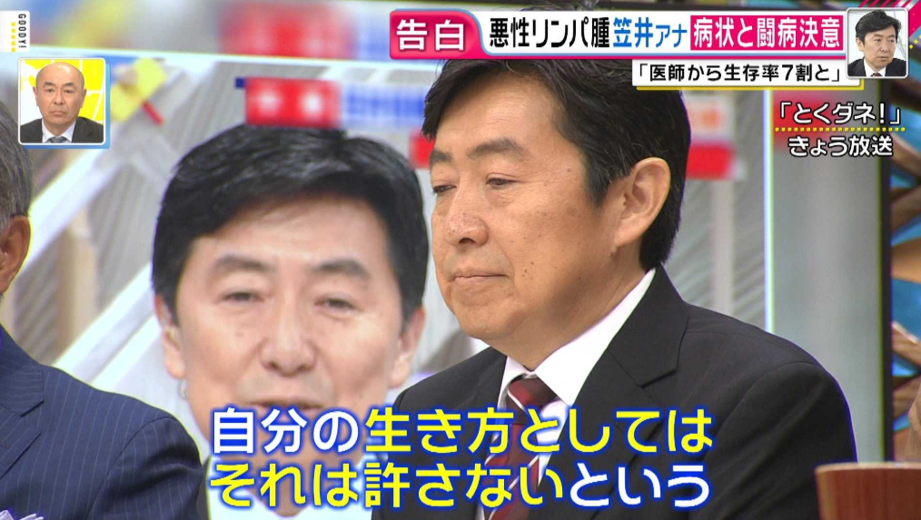 彼は、翌日19日には、『とくダネ!』の生放送に出演し、病名が「びまん性大細胞型B細胞リンパ腫」であることや、公表に至った心情などについて語り、また、闘病中の現在も積極的にブログやSNSを更新しています。