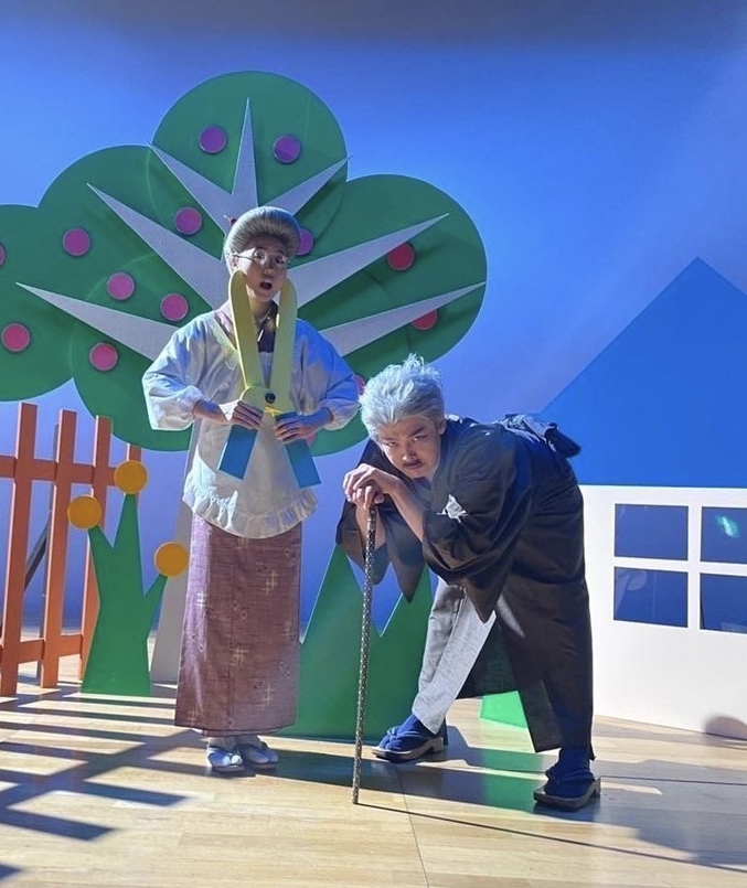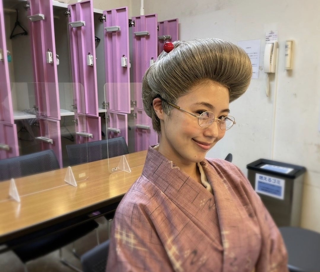 Instagramで公開したのはその際の衣装姿で、有村さんは結い上げたシルバーヘアで丸眼鏡をかけ、絣柄の着物を着てにんまりとした笑みを浮かべています。