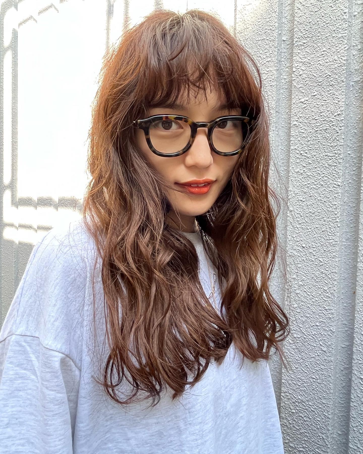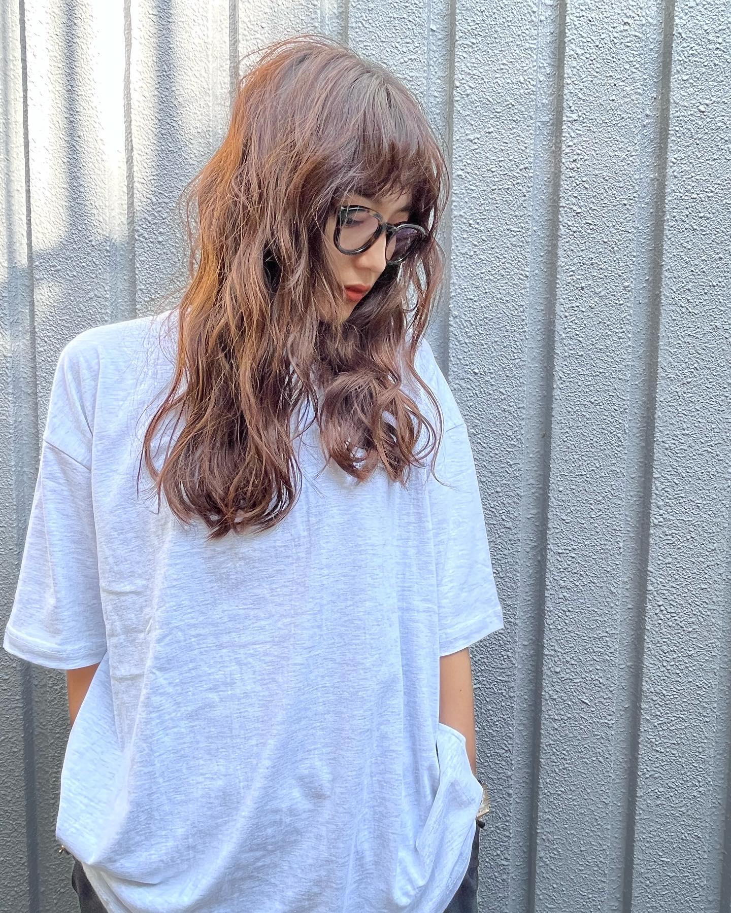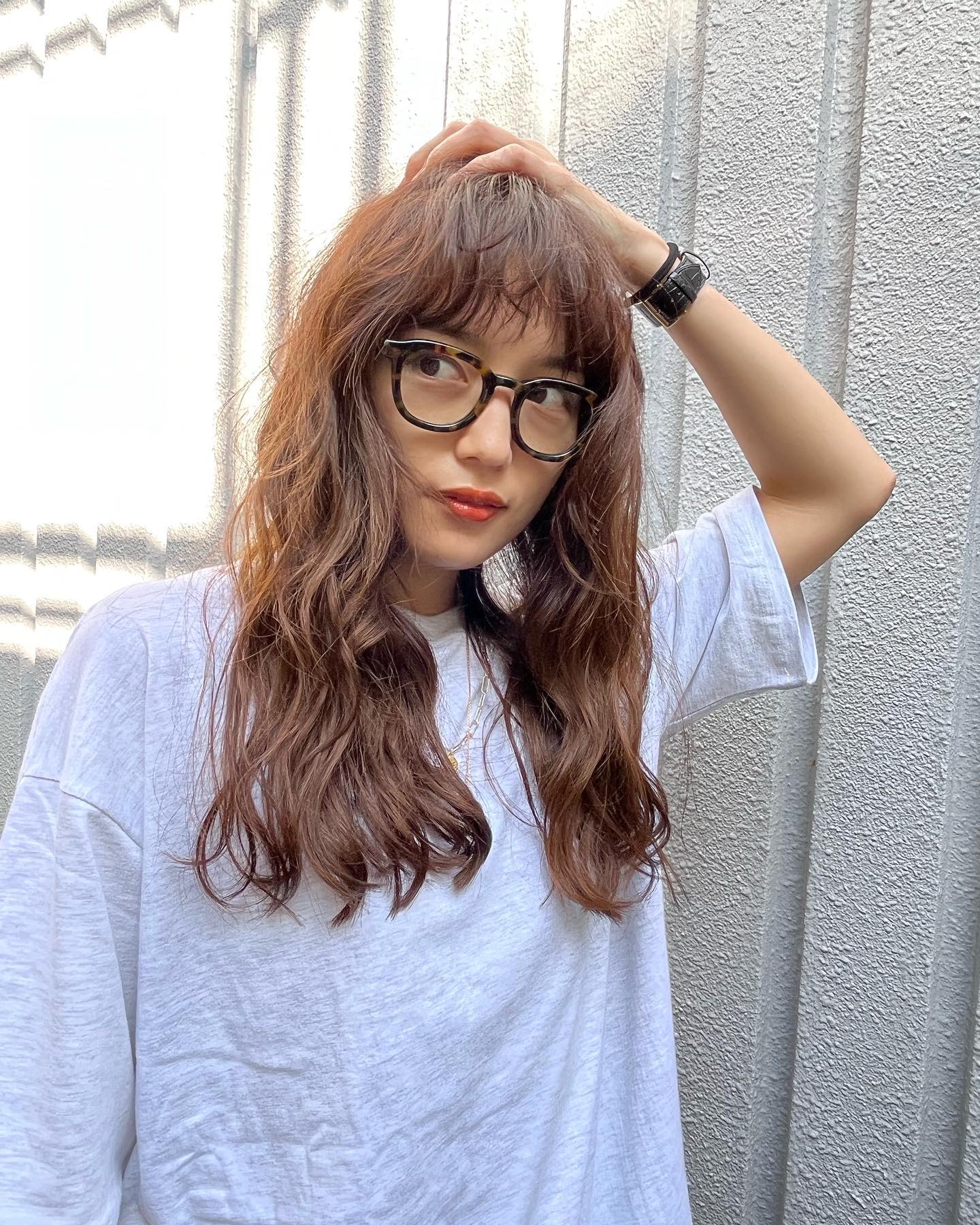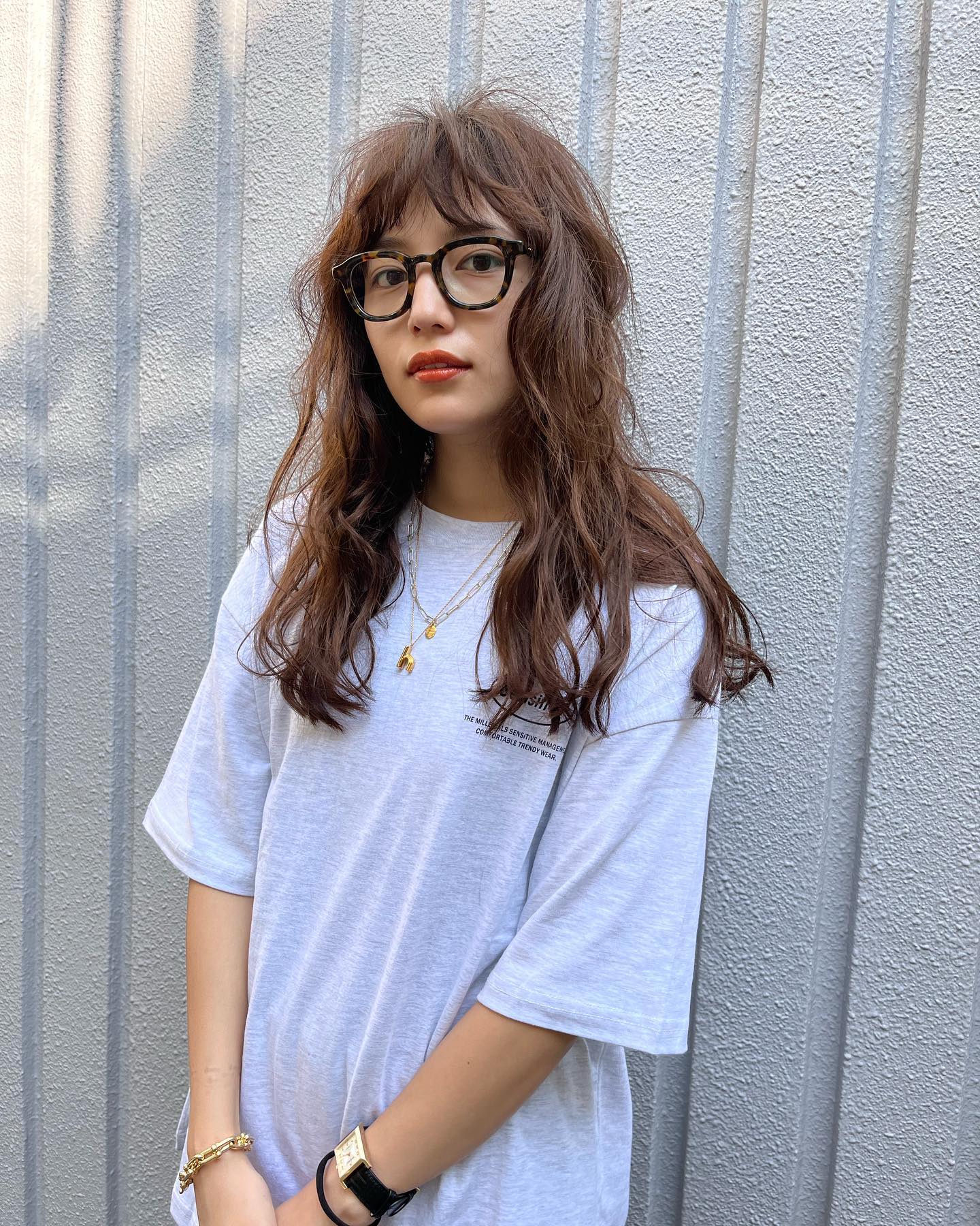 明るめのブラウンカラーは光が当たると透けて見えて綺麗で、べっこう柄の大きなメガネともお似合いです。また、シンプルな白のTシャツを合わせたカジュアルなコーディネートにも注目を集めています。