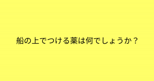 「船の上でつける薬は何でしょうか?」 頭の回転が速い人は簡単すぎる問題かも? 今回ご紹介するのは脳トレクイズです。 問題 :船の上でつける薬は何でしょうか? Google ADVERTISEMENT Google あなたはわかりましたか? それでは答え合わせに行きましょう! Google 答えは、、、「温湿布(on ship)」 ADVERTISEMENT 船の上を英語で表すと「on ship」になります。on shipだけに、「温湿布(on ship)」が答えとなります。 ADVERTISEMENT Google あなたは間違えずに解けたでしょうか! Google [著作権者VONVON /無断コピー、無断転載および再配布禁止(違反時の法的措置) ADVERTISEMENT