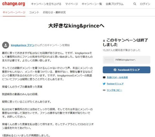 脱退発表から数日が経った10日、キンプリファンたちの憶測や妄想、悲しい気持ちや多くの考え意見が飛び交うSNS上で突如出てきた「King & Prince脱退白紙、ジェリー氏社長退任」というのをテーマにした署名活動が行われていました。