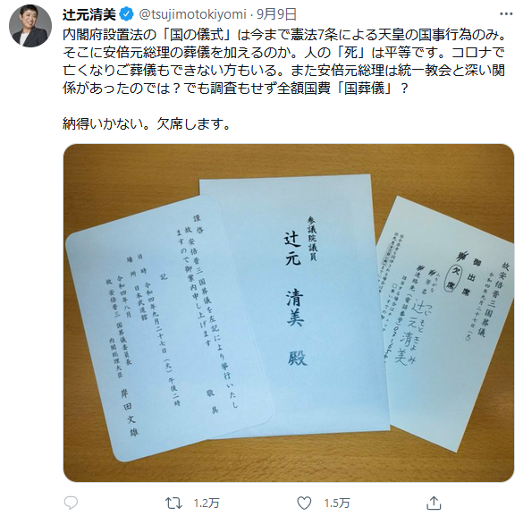 辻元氏は国葬に参列しませんが心の中で手を合わせていることでしょうね。