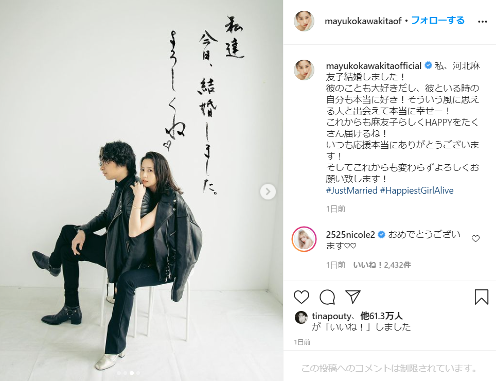 「これからも麻友子らしくHAPPYをたくさん届けるね!」とファンに向けて胸中を明かしていました。また、2人は都内の区役所に婚姻届を提出。すでに同居しているが、妊娠しておらず、今後も仕事を続けるという。