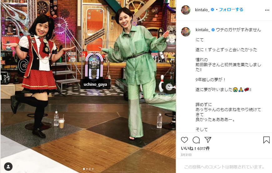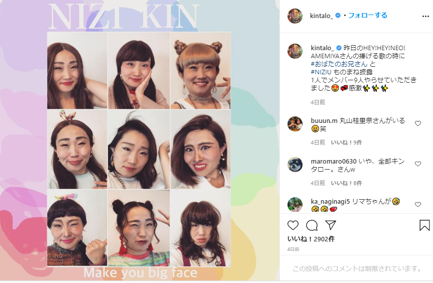 《昨日のHEY!HEY!NEO! AMEMIYAさんの捧げる歌の時に #おばたのお兄さん と #NIZIU ものまね披露1人でメンバー9人やらせていただきました 感激》と キンタロー。さんは、コメントし、1枚の写真に『NiziU』のメンバー全員をイメージした、渾身の顔マネを披露。また、写真には同グループの楽曲『Make you happy』と掛けて、『Make you big face』と自虐タイトルを添えた加工も 施していたのでした。