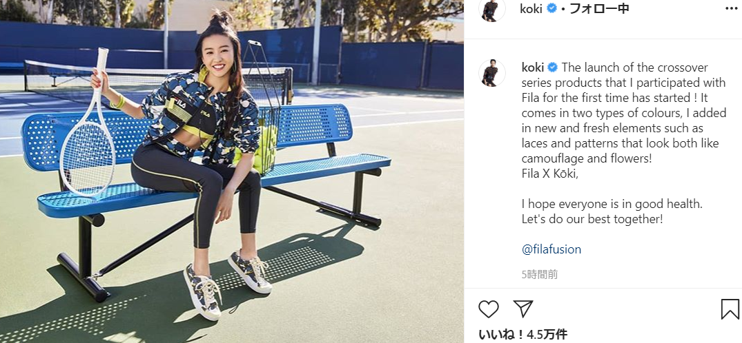 Kōki, さんは、割れた腹筋がチラリと見えるスポーツウェアでテニスラケットを持った爽やかなショットを投稿。その上で「みなさんの健康を願っています。一緒に頑張りましょう!」と英文でつづっていました。