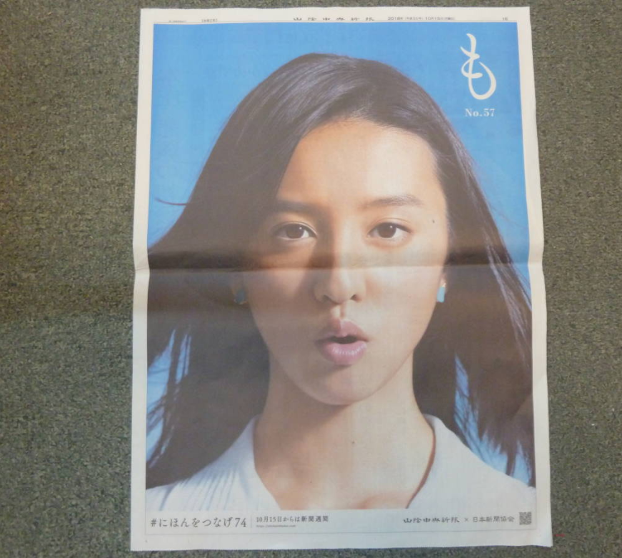 これは、今週から始まる「新聞週間」にちなんだ広告であり、「#にほんをつなげ74」というテーマで新聞協会加盟の74紙で掲載されています。