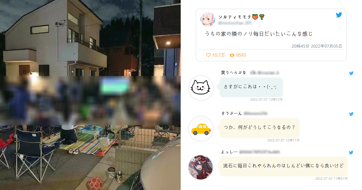 【画像あり】毎日がお祭り!?賑やかすぎるご近所さん。騒音に耐えきれず引っ越した住民も…「しんどすぎる」「これは酷い」