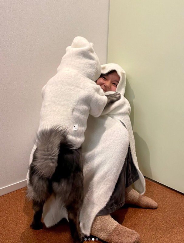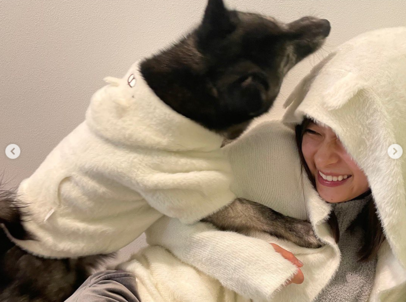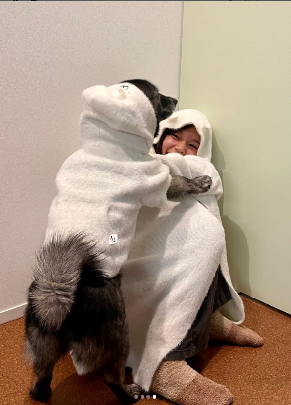 投稿された写真はファッションブランドとコラボしたパーカーをおそろいで身につけた芳根さんと犬の写真。