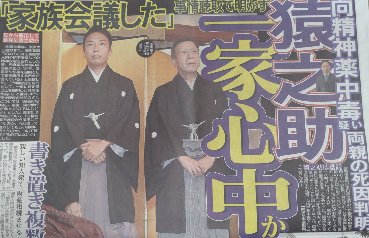翌18日には猿之助が共演する役者やスタッフたちにセク⚫️ラ、パワ⚫️ラを日常的に行っていることを告発する内容が週刊誌に発売されました。家には、猿之助が病院で処方してもらった睡眠導入剤がたまっていたことから、猿之助は自室にある薬箱から大量にそれを持ち出し、深夜0時ごろに両親はそれぞれ10錠ほどを口に含むと、間もなく意識を失ったそうです。猿之助は部屋にあったビニール袋を手に取り、その顔に被せていき、そして、47年間の歳月をともに過ごした両親に、それぞれ別れを告げたと言います。