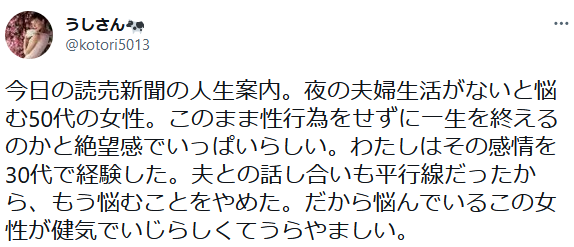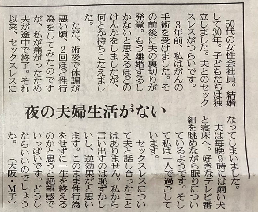 今日ご紹介するのは結婚30年になる50代女性からのお悩み相談です。お悩みは夫との夜の生活に関するもので、この問題を抱える夫婦は世の中に多いのではないでしょうか。それではさっそく本文に入っていきましょう。