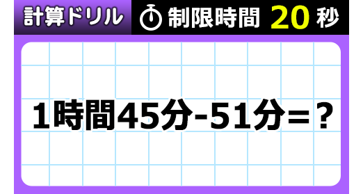 時間同士の計算問題に挑戦してみましょう!時間のひき算方法、覚えてますか? 今回ご紹介するのは脳トレクイズです。本日は計算問題に挑戦! Google Google ADVERTISEMENT あなたはわかりましたか? それでは答え合わせに行きましょう! Google 答えは、、、 「54分」 1時間(=60分)から51分を引いて、残った9分と45分を足しましょう。 ADVERTISEMENT Google あなたは間違えずに解けたでしょうか! Google [著作権者VONVON /無断コピー、無断転載および再配布禁止(違反時の法的措置) ADVERTISEMENT