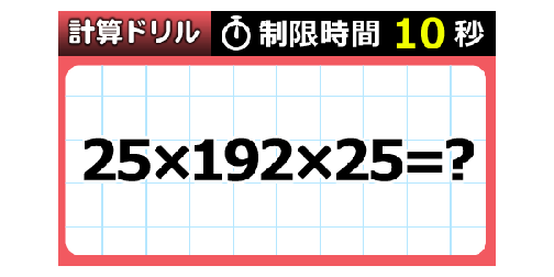 「25×192×25」の計算を10秒で解いてみましょう!暗算が得意だったらカンタン!? 今回ご紹介するのは脳トレクイズです。本日は計算問題に挑戦! Google Google ADVERTISEMENT あなたはわかりましたか? それでは答え合わせに行きましょう! Google 答えは、、、 「120000」。 ADVERTISEMENT 素早く解くコツは25×4×12×4×25と分解して、25×4を見つけること。 そうすると、25×4=100なので残りを暗算するだけですね。 ADVERTISEMENT Google あなたは間違えずに解けたでしょうか! Google [著作権者VONVON /無断コピー、無断転載および再配布禁止(違反時の法的措置)] ADVERTISEMENT