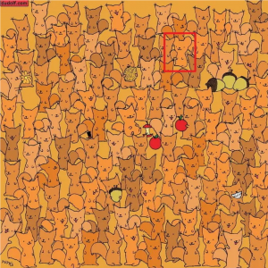 絵探しの方法はごく単純です。多くの人たちの間に隠れている一匹の猫を見つけ出せればいいのです。