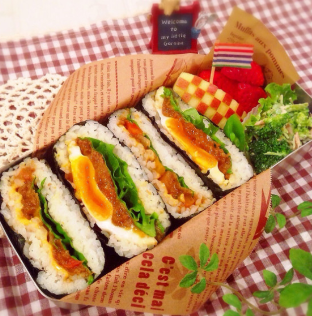 おにぎりって綺麗に三角や丸い形にするのって、意外と難しいんですよね。そんな方にオススメなのが、この『おにぎらず弁当』。年々、握らないおにぎり・通称おにぎらずが有名になっていますが、これを弁当箱に詰め込むことで、パンパンに入ったボリュームたっぷりのお弁当に仕上げることが出来ます。おにぎらずはビジュアルだけじゃなく、食べやすさにも定評があります。また、何の具が入っているのかパッと見で分かるので、おにぎりの種類を覚える必要がありません。手軽に済ませたいなら、このおにぎらず弁当で決まりです。